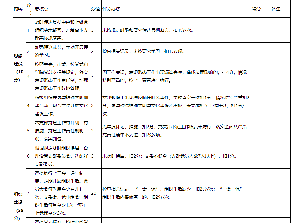 (三)总支考核。党总支对被考核人年度工作内容进行考核、评分,重点查看支撑材料。