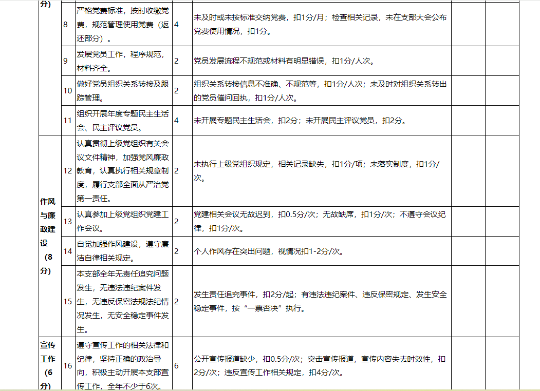 (二)日常考核主要考察党支部书记日常工作表现,党总支按照考核工作内容定期检查、考核评分,直接计入年终考核。
