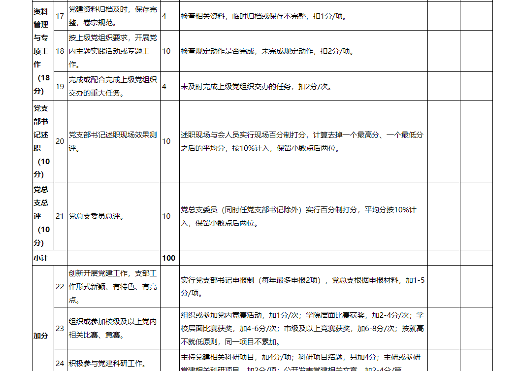 (二)计算公式为:考核总分=基础工作分+党支部书记述职现场效果测评分+党总支总评分+加分。