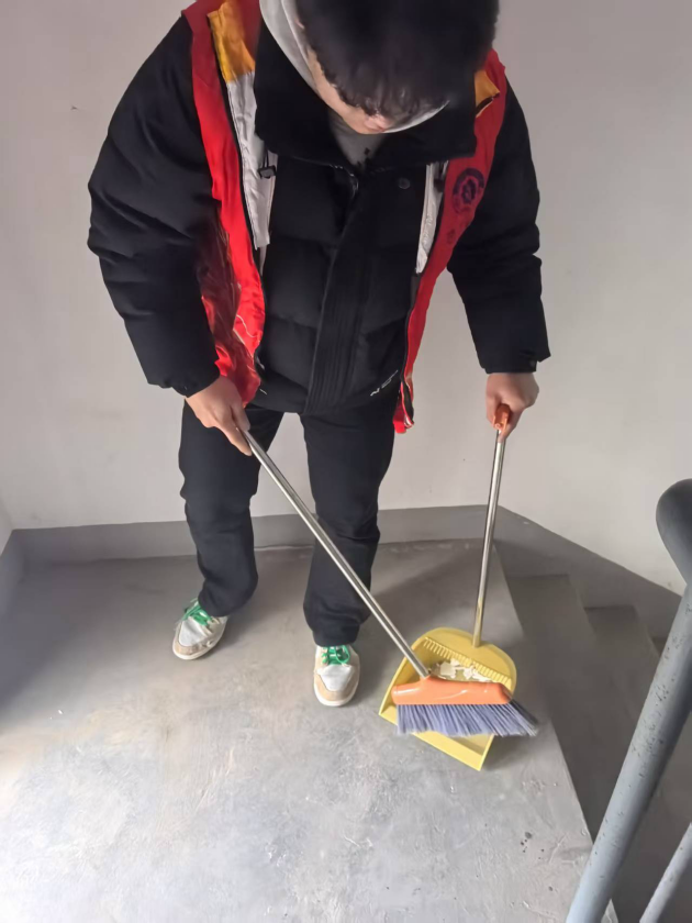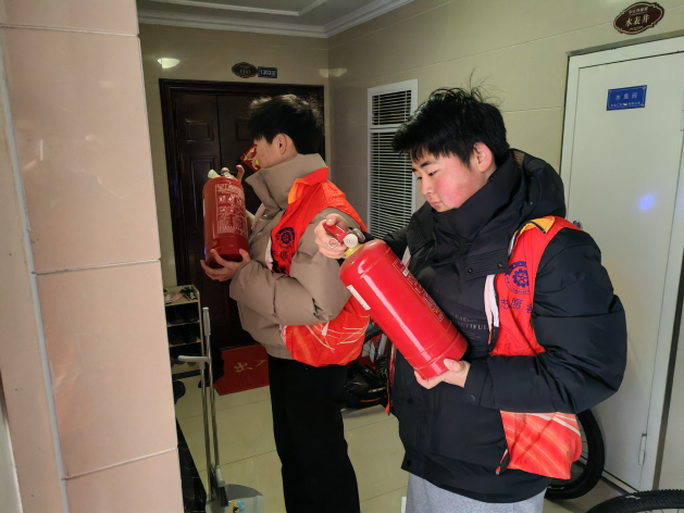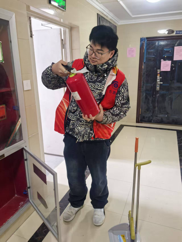 在社区工作者的带领下,青年志愿者们兵分多路,投入到紧张而有序的志愿服务中。一部分志愿者聚焦于楼道安全,仔细检查每一层楼道的灭火器。他们查看灭火器的压力表是否处于正常范围,软管有无破损老化,喷嘴是否畅通无阻,还向居民宣传消防知识,提醒大家注意用火用电安全。另一部分志愿者则担当起“卫生使者”的角色,手持扫帚、垃圾钳等清洁工具,认真清扫小区道路两旁的垃圾,不放过任何一个卫生死角。他们还协助居民清理楼道内的堆物,使楼道恢复整洁通畅。尽管任务繁重,但志愿者们干劲十足,天气的寒冷,也挡不住他们服务的热情。